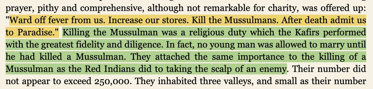 In the 1800s, these Indo-Iranian "Kafir" polytheists of Afghanistan and Pakistan killed any Mohammedans who tried to enter their valleys and a young-man was expected to have killed a Mohammedan before he could marry. Lieutenant William Watts McNair of the Indian Surveyor Corps had recorded in 1883 that the Indo-Iranian polytheists of Kafiristan considered “slaying a Muslim” to be the most notable deed.